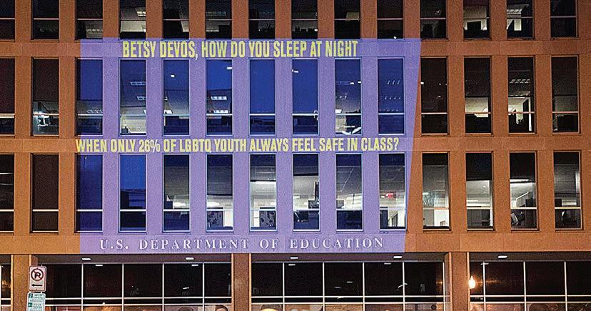 It was intended as a wake up call. The Human Rights Campaign and artist Robin Bell projected LED-illuminated messages onto the U.S. Department of Education’s headquarters in Washington, D.C.: “Betsy DeVos, how do you sleep at night when 95 percent of LGBTQ youth struggle to?”