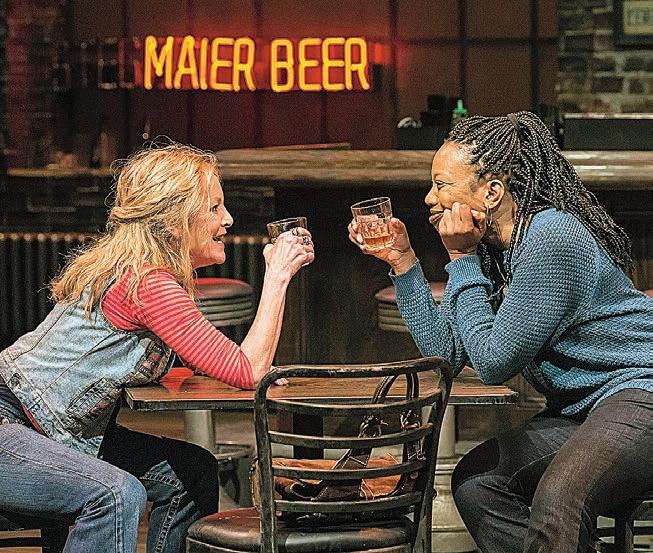 From there the play switches back to 2000, with a series of scenes set a month apart in that year, as we see the events that led up to the young men’s incarceration. Most of the action is set in a local bar, a sprawling, industrial space in Christopher Barreca’s impressive design, where a gang of locals hang out after work at a nearby factory. Cynthia (Portia) is the mother of Chris, and she has put in 24 years “on the floor,” while lifelong friend Tracey (Mary Mara), the mother of Jason, has logged 26 years. Birthday girl Jessie (Amy Pietz) rounds out the trio and drinks way too much. Stan (Michael O’Keefe) has been bartender since a workrelated accident ended his time at the factory. Colombian-American Oscar (Peter Mendoza) is the ambitious bar back, working quietly to clean and restock while planning a better life.