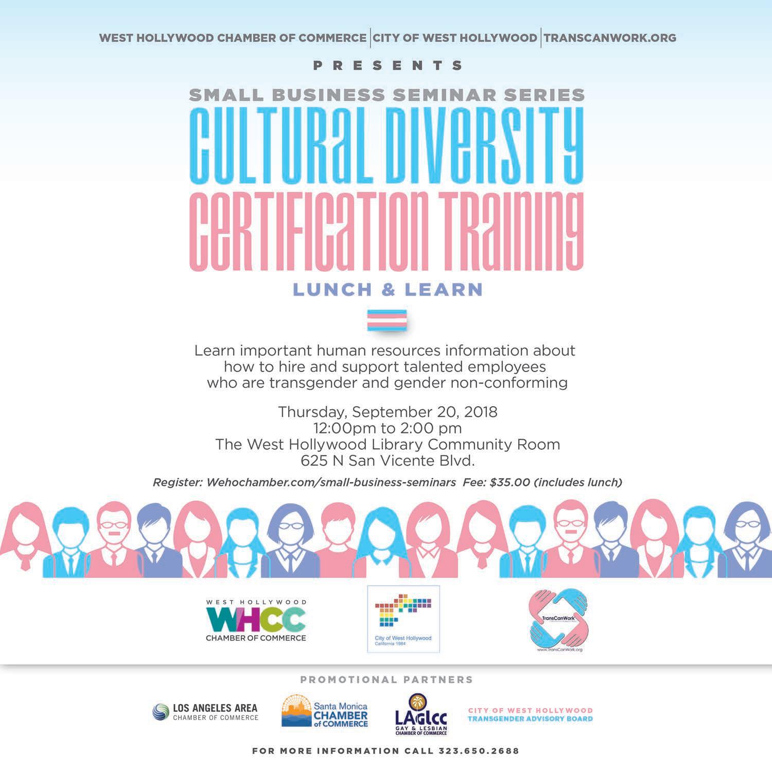 West Hollywood Chamber of Commerce Cultural Diversity Certification Training, Thu. Sep. 20 @ 12:00 Noon to 2:00 PM at West Hollywood Library Community Room (625 N San Vicente Blvd). WeHo’s Chamber of Commerce, the City of West Hollywood and Trans Can Work present a Cultural Diversity Certification Training Lunch & Learn event, perfect for any business interested in: Hiring an untapped pool of