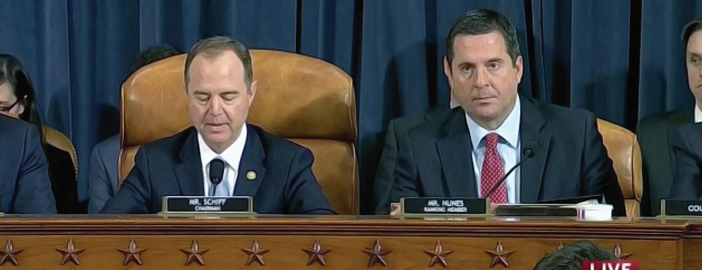 Nunes’ opening statement at the televised inquiry was replete with conservative talking points and conspiracy theories. And he mocked the two credible witnesses, Trump appointees, saying that the main staged performance by the Democrats — “the Russia hoax — has ended, and you’ve been cast in the low-rent Ukrainian sequel.” Schiff, a former federal prosecutor, on the other hand, wore the solemnity of the constitutional crisis on his face.