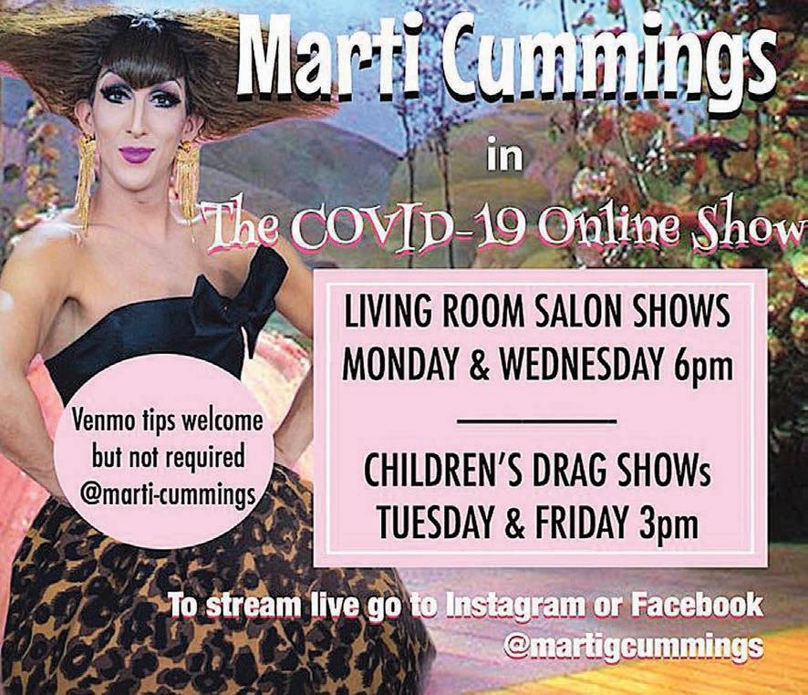 ‘Tune into the online shows and support artists that way,’ advises Marti Cummings. To tip this queen, visit martigcummings.com.