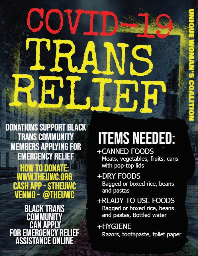TransLatin@ Coalition is an organization formed by Trans Latin@ leaders to organize and advocate for the needs of Trans Latin@s immigrants who reside in the U.S. The organization functions not only to advocate for trans inclusive policies and immigration rights in the public sphere, it also offers the shelter and support of the community and is especially relevant now. Many immigrant trans people are unable to access the benefits others are now receiving during the pandemic and through connection with their community, TransLatin@ Coalition offers the support of like-impacted family, often food and connectedness to shelter and medical care. The State of California’s comprehensive COVID-19 website of resources is COVID19. CA.GOV. The City of Los Angeles is also offering resources at lacity.org.
