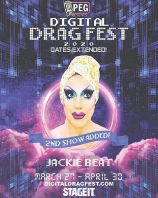Jackie: My last show SOLD OUT, so don’t waste time getting tickets to this digital drag delight that promises to feature nothing but feel-good classics... Absolutely NO Coronavirus references! A 100% COVID-19 free zone! Just a bunch of classy songs about drag, dick, ‘n’ donuts. ALL LIVE SINGING! I am also guesting on Flaming Saddles Brunch, April 12, and Rhea Litre’s Quarantine Queen, April 13, both on Instagram Live.