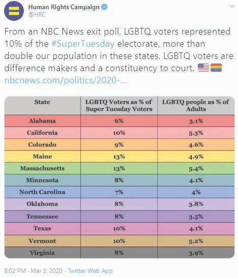 According to NBC News exit polling, Super Tuesday states, including California, brought out 4,339,000 LGBTQ voters and 21,153,000 Equality Voters, nearly doubling LGBTQ representation in the electorate.