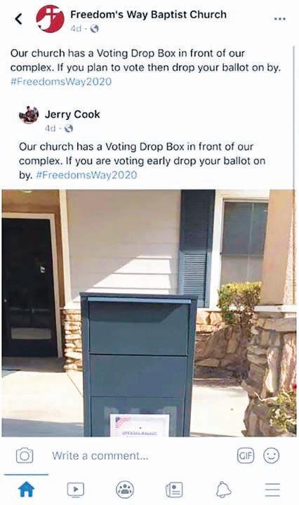 A church in North Los Angeles County, Freedom’s Way Baptist Church, known for its anti-LGBTQ and anti-women’s reproductive rights viewpoints, posted a picture on Facebook a few days ago of a grey metal container with a taped sign that read “Official Ballot Drop Box.”