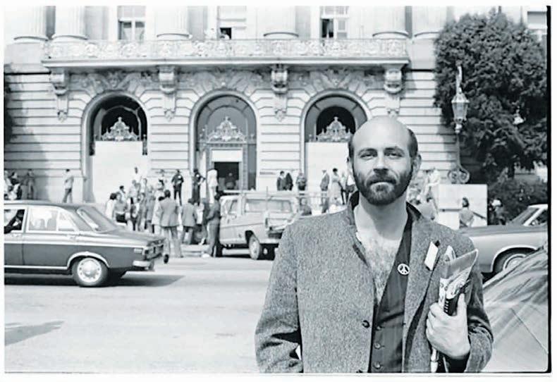 As Brooks read his poems to a crowd of 400,000 in City Hall plaza on June 25, 1978, “high overhead, the splendid rainbow fl ags were billowing in a blue sky as the afternoon sunlight illumined their prismatic colors.” Those Rainbow Flags, produced by Harvey Milk, Lee Mently, Lynn Segerblom, Gilbert Baker, James McNamara “and many others who did the work” for the gathering were to be Harvey Milk’s last parade before his assassination. “Still, he saw the fl ags he helped midwife serving those he nurtured whole-heartedly, acting in concert with his walk-the-walk friend, Lee Mentley, Godfather of the Rainbow Flag.”