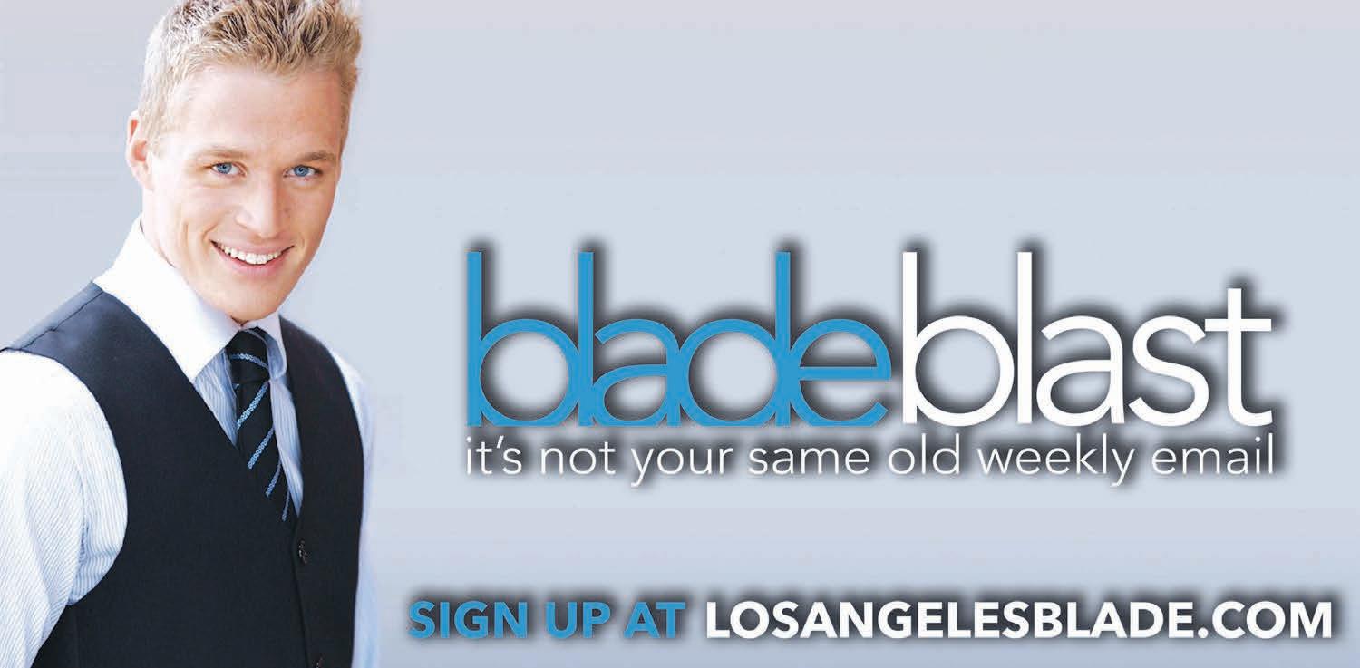 All material in the Los Angeles Blade is protected by federal copyright law and may not be reproduced without the written consent of the Los Angeles Blade. e sexual orientation of advertisers, photographers, writers and cartoonists published herein is neither inferred nor implied. e appearance of names or pictorial representation does not necessarily indicate the sexual orientation of that person or persons. Although the Los Angeles Blade is supported by many ne advertisers, we cannot accept responsibility for claims made by advertisers. Unsolicited editorial material is accepted by the Los Angeles Blade, but the paper cannot take responsibility for its return. e editors reserve the right to accept, reject or edit any submission. A single copy of the Los Angeles Blade is available from authorized distribution points, to any individual within a 50-mile radius of Los Angeles, CA. Multiple copies are available from the Los Angeles Blade o ce only. Call for rates. If you are unable to get to a convenient free distribution point, you may receive a 26-week mailed subscription for $195 per year or $5.00 per single issue. Checks or credit card orders can be sent to Phil Rockstroh at prockstroh@washblade.com. Postmaster: Send address changes