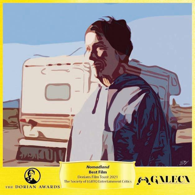 GALECA’s Dorian Awards honor the best in all of flm and TV, from mainstream to LGBTQ fare, on separate occasions. As revealed in the group’s three-hour Dorians Film Toast 2021, shown on LGBTQ+ streaming platform Revry and hosted by famed entertainer and human rights hero Karel, “Nomadland” earned 3 Dorians: Best Film, Best Director for ?-'#@+ Zhao, and Most Visually Striking Film. “;8(%18” earned Best Non-English Language A8'$+0'7/+%+/700#1,8(6+%3,1.//+(#&+2#1+B7-4C7(6+ Youn. “;%+<%8(.=” was deemed Best LGBTQ Film by GALECA, and the musical drama’s male lead, the late Chadwick Boseman, earned Best Film Performance—Actor.