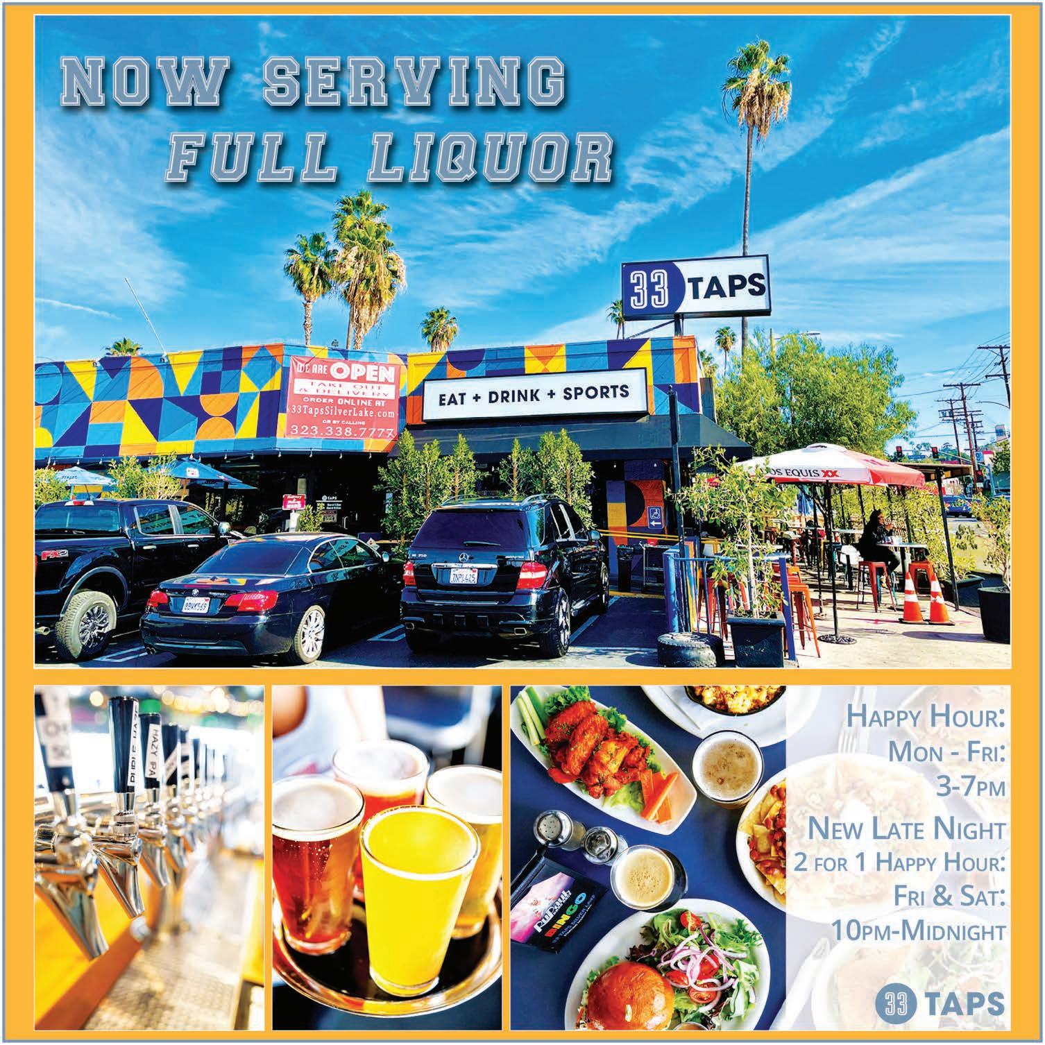 As Los Angeles slowly begins to reopen, and businesses and bars can welcome back customers, 33 Taps is greeting the postCOVID world with some new changes. “During the pandemic I had entered the liquor license lottery.” For businesses hoping for a budget break, the State of California holds a yearly liquor license lottery in which restaurants and bars can try their luck at a discounted license. “The state will issue however many licenses they think the market should absorb. You can buy those licenses for $15,000, which is a full liquor license — a type 47. Whereas on the open market, prices go from $100,000$120,000.” It was his fourth year entering the lottery, and his first time winning. It took the state months to process the license, but it finally issued 3725 Sunset Blvd. its firstever liquor license. It’ll be the first time in 40 years that the location will have a full bar.