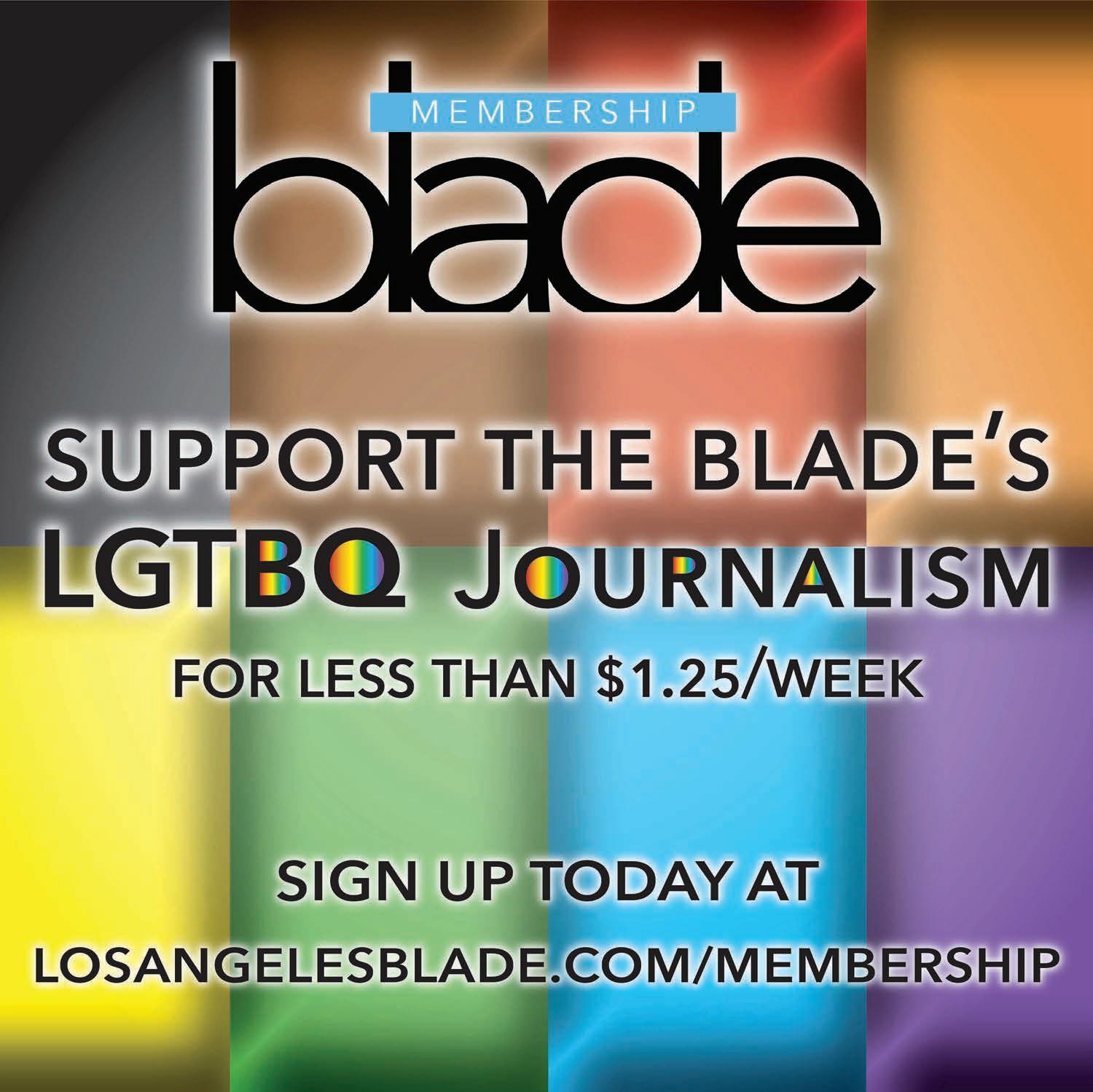 CHRISTOPHER JACKSON, 562-826-6602 All material in the Los Angeles Blade is protected by federal copyright law and may not be reproduced without the written consent of the Los Angeles Blade. e sexual orientation of advertisers, photographers, writers and cartoonists published herein is neither inferred nor implied. e appearance of names or pictorial representation does not necessarily indicate the sexual orientation of that person or persons. Although the Los Angeles Blade is supported by many ne advertisers, we cannot accept responsibility for claims made by advertisers. Unsolicited editorial material is accepted by the Los Angeles Blade, but the paper cannot take responsibility for its return. e editors reserve the right to accept, reject or edit any submission. A single copy of the Los Angeles Blade is available from authorized distribution points, to any individual within a 50-mile radius of Los Angeles, CA. Multiple copies are available from the Los Angeles Blade o ce only. Call for rates. If you are unable to get to