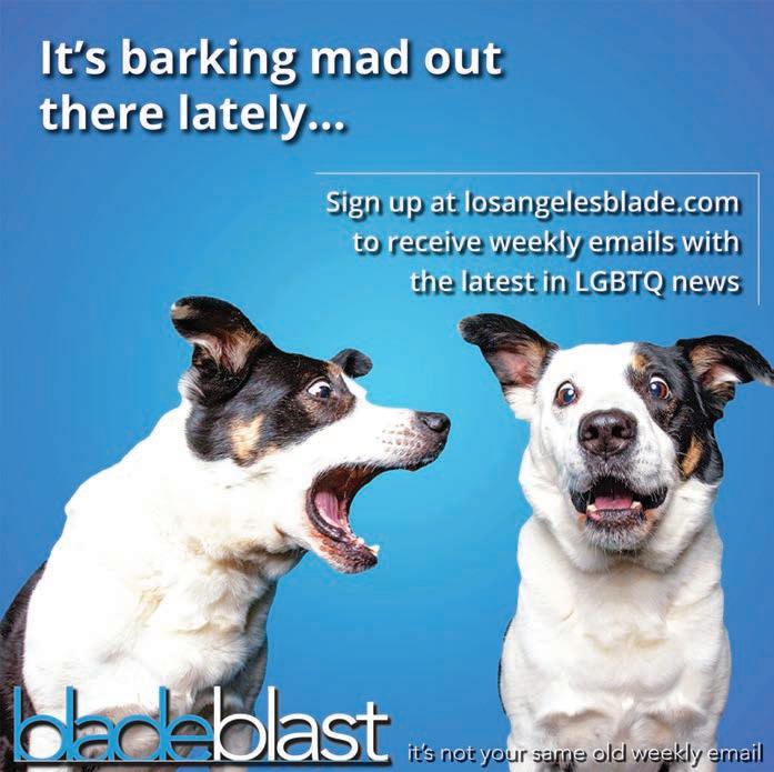All material in the Los Angeles Blade is protected by federal copyright law and may not be reproduced without the written consent of the Los Angeles Blade. e sexual orientation of advertisers, photographers, writers and cartoonists published herein is neither inferred nor implied. e appearance of names or pictorial representation does not necessarily indicate the sexual orientation of that person or persons. Although the Los Angeles Blade is supported by many ne advertisers, we cannot accept responsibility for claims made by advertisers. Unsolicited editorial material is accepted by the Los Angeles Blade, but the paper cannot take responsibility for its return. e editors reserve the right to accept, reject or edit any submission. A single copy of the Los Angeles Blade is available from authorized distribution points, to any individual within a 50-mile radius of Los Angeles, CA. Multiple copies are available from the Los Angeles Blade o ce only. Call for rates. If you are unable to get to a convenient free distribution point, you may receive a 26-week mailed subscription for $195 per year or $5.00 per single issue. Checks or credit