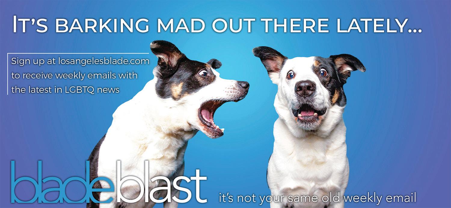 All material in the Los Angeles Blade is protected by federal copyright law and may not be reproduced without the written consent of the Los Angeles Blade. e sexual orientation of advertisers, photographers, writers and cartoonists published herein is neither inferred nor implied. e appearance of names or pictorial representation does not necessarily indicate the sexual orientation of that person or persons. Although the Los Angeles Blade is supported by many ne advertisers, we cannot accept responsibility for claims made by advertisers. Unsolicited editorial material is accepted by the Los Angeles Blade, but the paper cannot take responsibility for its return. e editors reserve the right to accept, reject or edit any submission. A single copy of the Los Angeles Blade is available from authorized distribution points, to any individual within a 50-mile radius of Los Angeles, CA. Multiple copies are available from the Los Angeles Blade o ce only. Call for rates. If you are unable to get to a convenient free distribution point, you may receive a 26-week mailed subscription for $195 per year or $5.00 per single issue. Checks or credit card orders can be sent to