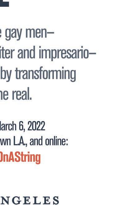All material in the Los Angeles Blade is protected by federal copyright law and may not be reproduced without the written consent of the Los Angeles Blade. e sexual orientation of advertisers, photographers, writers and cartoonists published herein is neither inferred nor implied. e appearance of names or pictorial representation does not necessarily indicate the sexual orientation of that person or persons. Although the Los Angeles Blade is supported by many ne advertisers, we cannot accept responsibility for claims made by advertisers. Unsolicited editorial material is accepted by the Los Angeles Blade, but the paper cannot take responsibility for its return. e editors reserve the right to accept, reject or edit any submission. A single copy of the Los Angeles Blade is available from authorized distribution points, to any individual within a 50-mile radius of Los Angeles, CA. Multiple copies are available from the Los Angeles Blade o ce only. Call for rates. If you are unable to get to a convenient free distribution point, you may receive a 26-week mailed subscription for $195 per year or $5.00 per single issue. Checks or credit card orders can be sent to Phil Rockstroh at prockstroh@washblade.com.