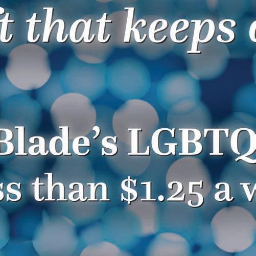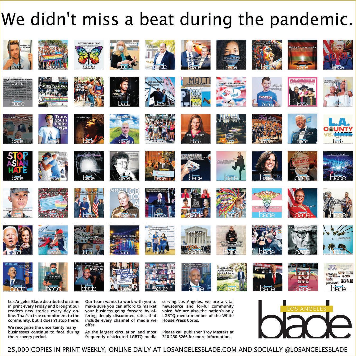 All material in the Los Angeles Blade is protected by federal copyright law and may not be reproduced without the written consent of the Los Angeles Blade. e sexual orientation of advertisers, photographers, writers and cartoonists published herein is neither inferred nor implied. e appearance of names or pictorial representation does not necessarily indicate the sexual orientation of that person or persons. Although the Los Angeles Blade is supported by many ne advertisers, we cannot accept responsibility for claims made by advertisers. Unsolicited editorial material is accepted by the Los Angeles Blade, but the paper cannot take responsibility for its return. e editors reserve the right to accept, reject or edit any submission. A single copy of the Los Angeles Blade is available from authorized distribution points, to any individual within a 50-mile radius of Los Angeles, CA. Multiple copies are available from the Los Angeles Blade o ce only. Call for rates. If you are unable to get to a convenient free distribution point, you may receive a 26-week mailed subscription for $195 per year or $5.00 per single issue. Checks or credit card orders can be sent to Phil Rockstroh at prockstroh@washblade.com. Postmaster: Send address changes to the Los Angeles Blade, PO BOX 53352 Washington, DC 20009. e Los Angeles Blade is published bi-weekly, on Friday, by Los Angeles Blade, LLC. Rates for businesses/institutions are $450 per year. Periodical postage paid at Los Angeles, CA., and additional mailing o ces. Editorial positions of the Los Angeles Blade are expressed in editorials and in editors’ notes as determined by the paper’s editors. Other opinions are those of the writers and do not necessarily represent the opinion of the Los Angeles Blade or its sta To submit a letter or commentary: Letters should be fewer than 400 words; commentaries should be fewer than 750 words. Submissions may be edited for content and length, and must include a name, address and phone number for veri cation. Send submissions by e-mail to tmasters@losangelesblade.com. :;<;=.-(%.!)5$-$%.1-!"$>.--7?