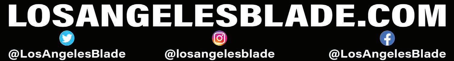All material in the Los Angeles Blade is protected by federal copyright law and may not be reproduced without the written consent of the Los Angeles Blade. e sexual orientation of advertisers, photographers, writers and cartoonists published herein is neither inferred nor implied. e appearance of names or pictorial representation does not necessarily indicate the sexual orientation of that person or persons. Although the Los Angeles Blade is supported by many ne advertisers, we cannot accept responsibility for claims made by advertisers. Unsolicited editorial material is accepted by the Los Angeles Blade, but the paper cannot take responsibility for its return. e editors reserve the right to accept, reject or edit any submission. A single copy of the Los Angeles Blade is available from authorized distribution points, to any individual within a 50-mile radius of Los Angeles, CA. Multiple copies are available from the Los Angeles Blade o ce only. Call for rates. If you are unable to get to a convenient free distribution point, you may receive a 26-week mailed subscription for $195 per year or $5.00 per single issue. Checks or credit card orders can be sent to Phil Rockstroh at prockstroh@washblade.com.