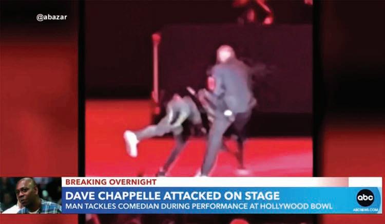 LOS ANGELES – Comedian Dave Chappelle was attacked during a performance at the Hollywood Bowl Tuesday night. A suspect is in custody for rushing the stage while brandishing a plastic replica of a gun that shoots forth a blade, according to the Los Angeles Police Department. After regaining his composure, Chappelle joked that the attacker “was a trans man,” a reference to the comic’s controversy within the LGBTQ+ communities.