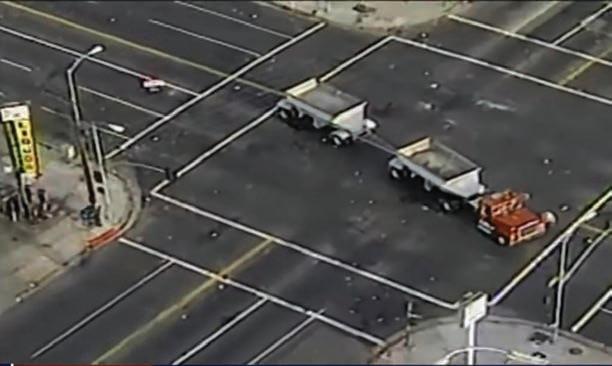 The civil unrest had commenced with gatherings of angered Angelenos especially Black residents not long after the verdict had been announced. But by 5:30 p.m. mobs had started to roam the streets of South Central LA with some limited property damage and vandalism. Then at around 6:46 p.m., a truck entered the intersection at Florence and Normandie. Tur and her Los Angeles News Service/KCOP 13 chopper crew caught what happened next and the live feed from the helicopter was broadcast to the nation and the world. A group of Black men who came to be known as the “L.A. Four” grabbed the 39-year-old truck driver, Reginald Oliver Denny and dragged him out of the truck.
