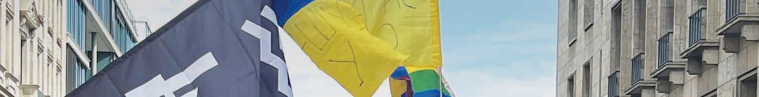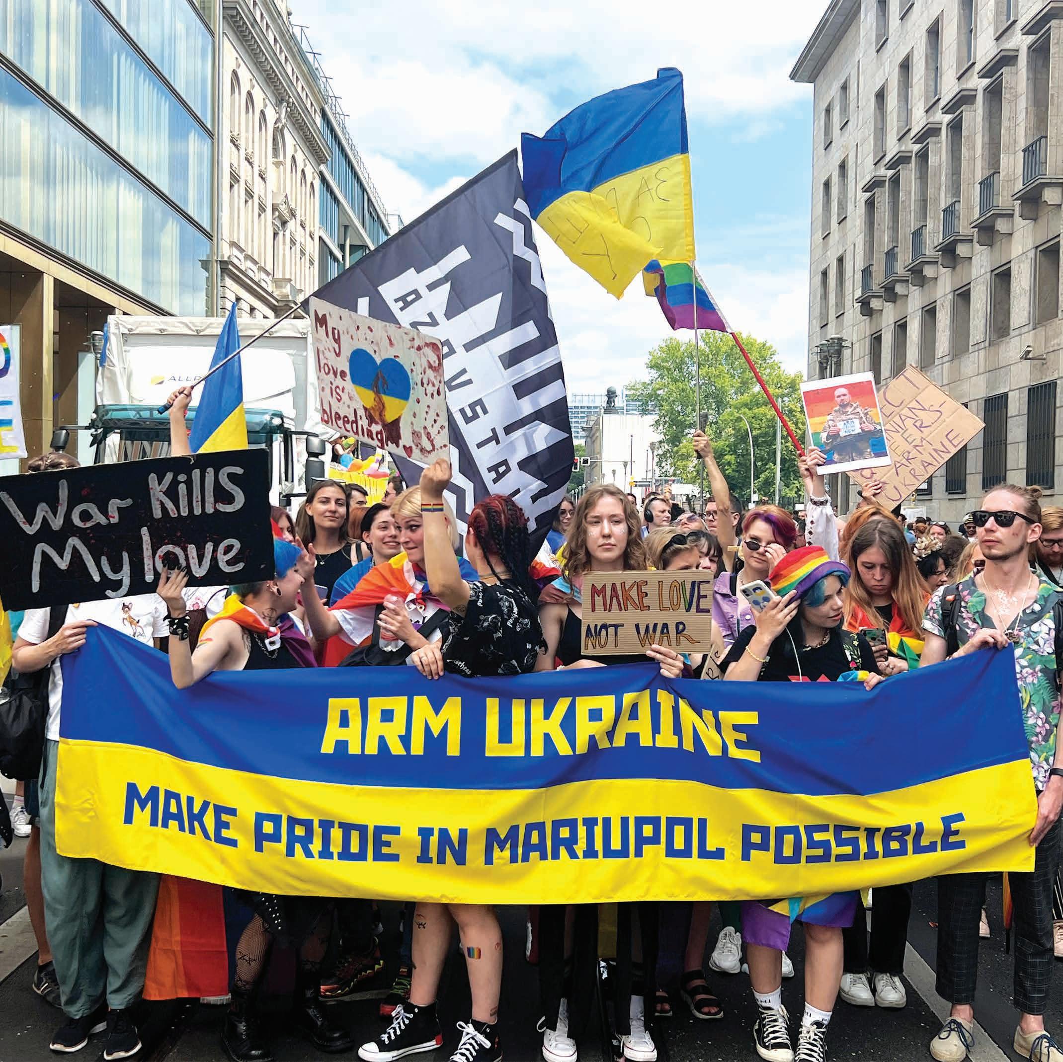 &*?06J5*6A*-40H3=09*3=8>*4*K8J=*4@>*1=886D*+*/3=*H68609*6A* Ukraine’s flag — banner that read “Arm Ukraine: Make Pride in Z40.J568*5699.K8=S*D3.8=*6/3=09*9.-581*H400.=>*/3=*BC04.@.4@* flag.