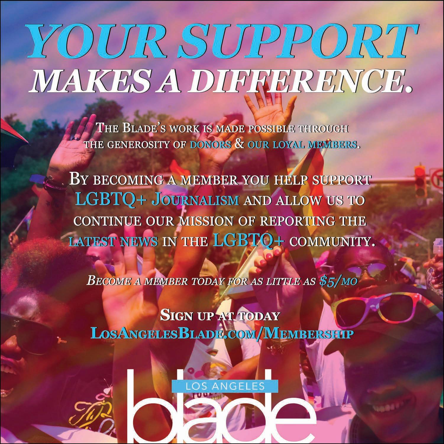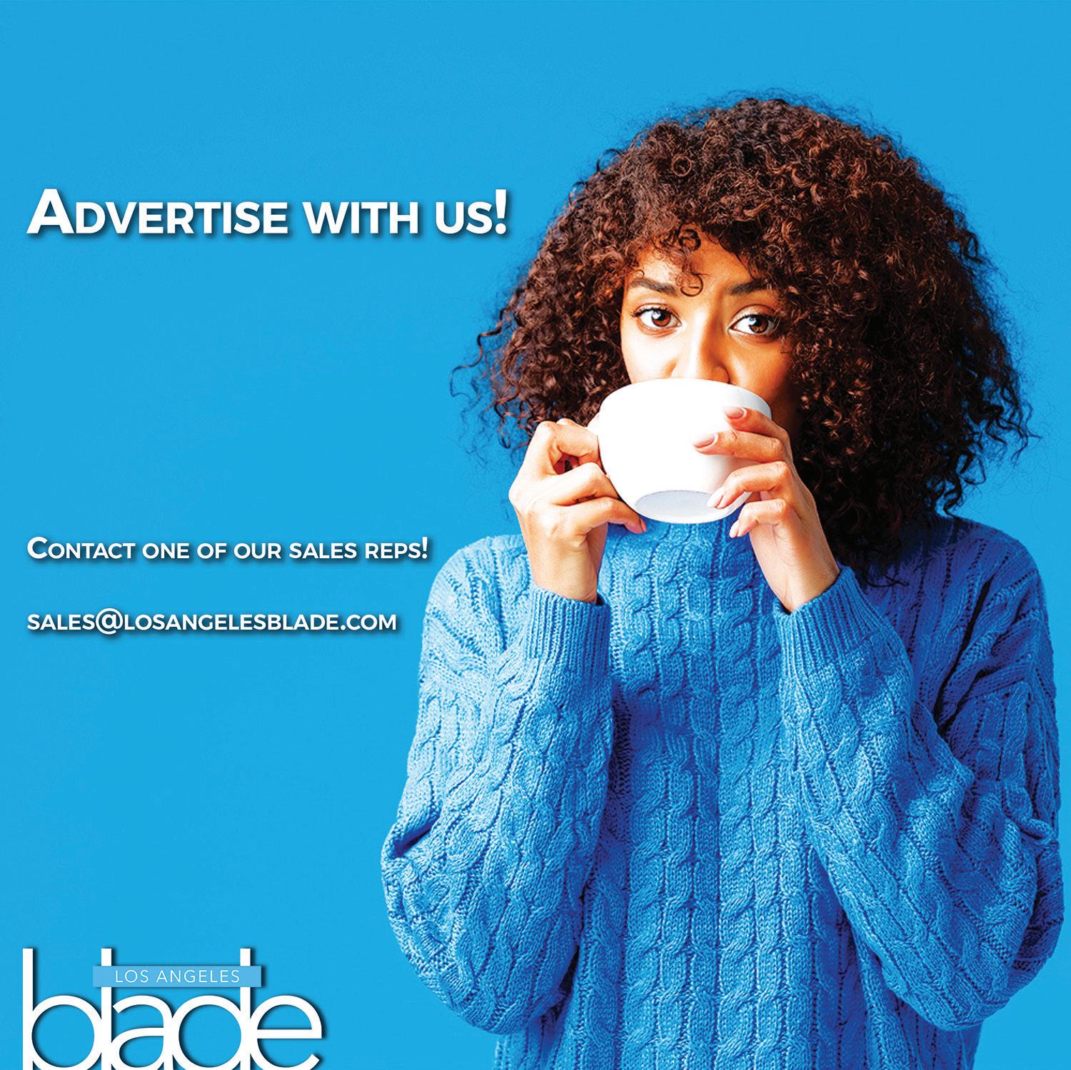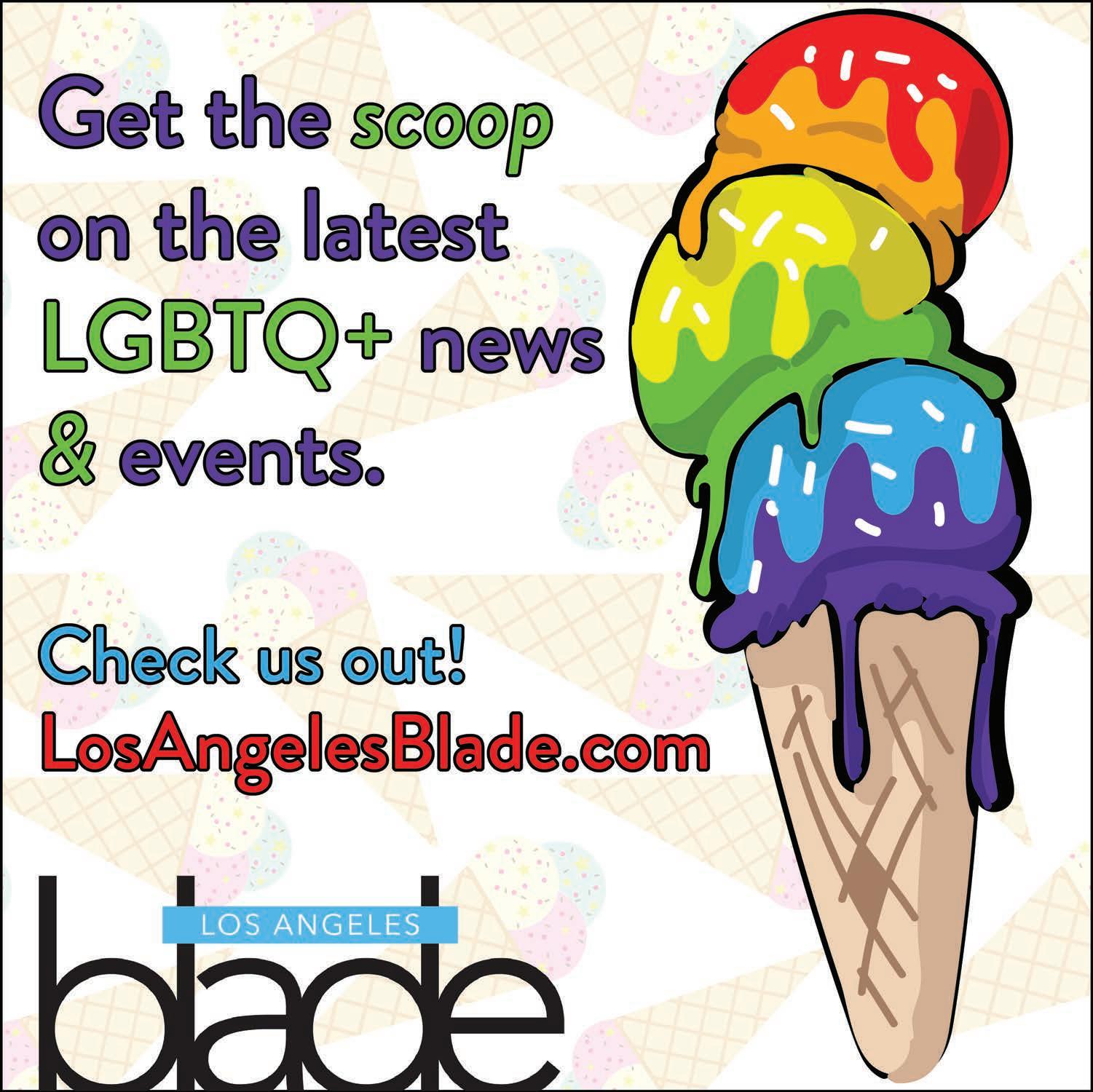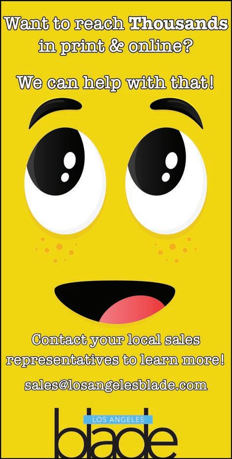 CHRISTOPHER JACKSON, 562-826-6602 All material in the Los Angeles Blade is protected by federal copyright law and may not be reproduced without the written consent of the Los Angeles Blade. e sexual orientation of advertisers, photographers, writers and cartoonists published herein is neither inferred nor implied. e appearance of names or pictorial representation does not necessarily indicate the sexual orientation of that person or persons. Although the Los Angeles Blade is supported by many ne advertisers, we cannot accept responsibility for claims made by advertisers. Unsolicited editorial material is accepted by the Los Angeles Blade, but the paper cannot take responsibility for its return. e editors reserve the right to accept, reject or edit any submission. A single copy of the Los Angeles Blade is available from authorized distribution points, to any individual within a 50-mile radius of Los Angeles, CA. Multiple copies are available from the Los Angeles Blade o ce only. Call for rates. If you are unable to get to a convenient free distribution point, you may receive a 26-week mailed subscription for $195 per year or $5.00 per single issue. Checks or credit card orders can be sent to Phil Rockstroh at prockstroh@washblade.com. Postmaster: Send address changes to the Los Angeles