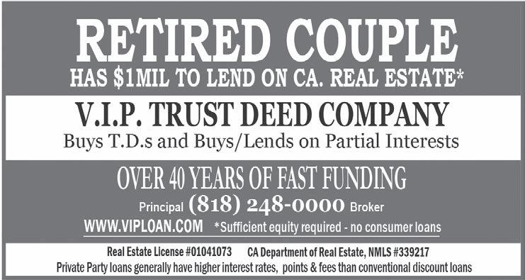 $1 MIL for business purpose Real Estate loans. Credit unimportant. V.I.P. Trust Deed Company www.viploan.com Call 1-818-248-0000 Broker-principal DRE 01041073. No Consumer Loans.