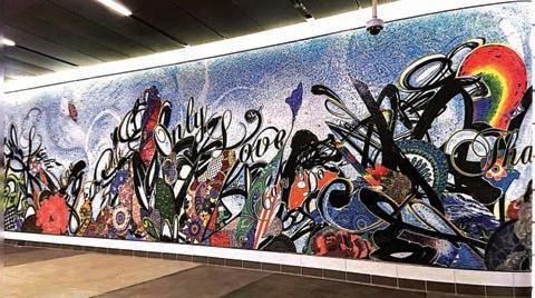 Artist Jaime Scholnick’s vivid -foot mural, which consists of 70 panels, was installed in January at the station at Crenshaw and Exposition Boulevards, the first stop along the 8.5 mile line. Her piece, “Layered Histories,” is an intricate collage of porcelain-glaze-on-steel based on “tens of thousands of images” of the surrounding neighborhood where she spent much of her time while in graduate school.