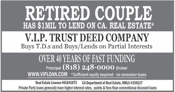 $1 MIL for business purpose Real Estate loans. Credit unimportant. V.I.P. Trust Deed Company www.viploan.com Call 1-818-248-0000 Broker-principal DRE 01041073. No Consumer Loans.