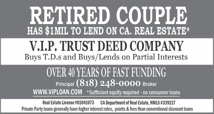 $1 MIL for business purpose Real Estate loans. Credit unimportant. V.I.P. Trust Deed Company www. viploan.com Call 1-818-2480000 Broker-principal DRE 01041073. No Consumer Loans.