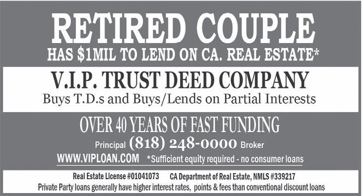 RETIRED COUPLE $$$$ for business purpose Real Estate loans. Credit unimportant. V.I.P. Trust Deed Company www.viploan.com Call 1-818248-0000. Broker-principal DRE 01041073. No consumer loans.