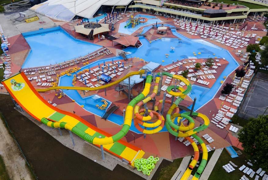 Guaranteed water fun when you rely on Brescia-based Acquapark. A name, a guarantee Acquapark srl has been designing, manufacturing and installing everything related to water fun for more than 30 years: from water slides for adults and children to interactive water games, from spray parks to slow and fast rivers, from wave pools to water surfing installations, from lagoons to water fountains of all shapes and sizes. Structural solidity, high safety standards, attractive design and high playability are the hallmarks of Acquapark products, thanks to which the Brescian company has conquered an Italian and international clientele that has become loyal to it over time. An example? Camping Isolino, a threestar campsite in the province of Verbania, on the shores of Lake Maggiore. The facility, known and appreciated by Italian and foreign tourists - especially families with children - for the quality and richness of its services, this year decided to innovate its 1,600 square metre swimming pool complex by replacing the main attraction - an aquatic playground, purchased in 2009 from Acquapark - with something similar in concept, but larger and richer. The campsite once again placed its trust in the skills of the Bresciabased company, which, to coincide with the opening of the summer season, handed over a colourful and imposing Fantasy Castle: a play structure with nine towers and seven slides (closed and open) of various lengths, barrels and chests that, once filled with water, pour it over passers-by, fountains with scenographic sprays, water jets, interactive games; and to complete the whole, cute water shooting subjects on the edge of the pool. Feedback from Camping guests was immediately positive. The Acquapark Fantasy Castle proved to be the right attraction to bring liveliness to the pools and the perfect place where children can have fun in complete safety, while also learning to socialise, share and develop creativity and imagination.