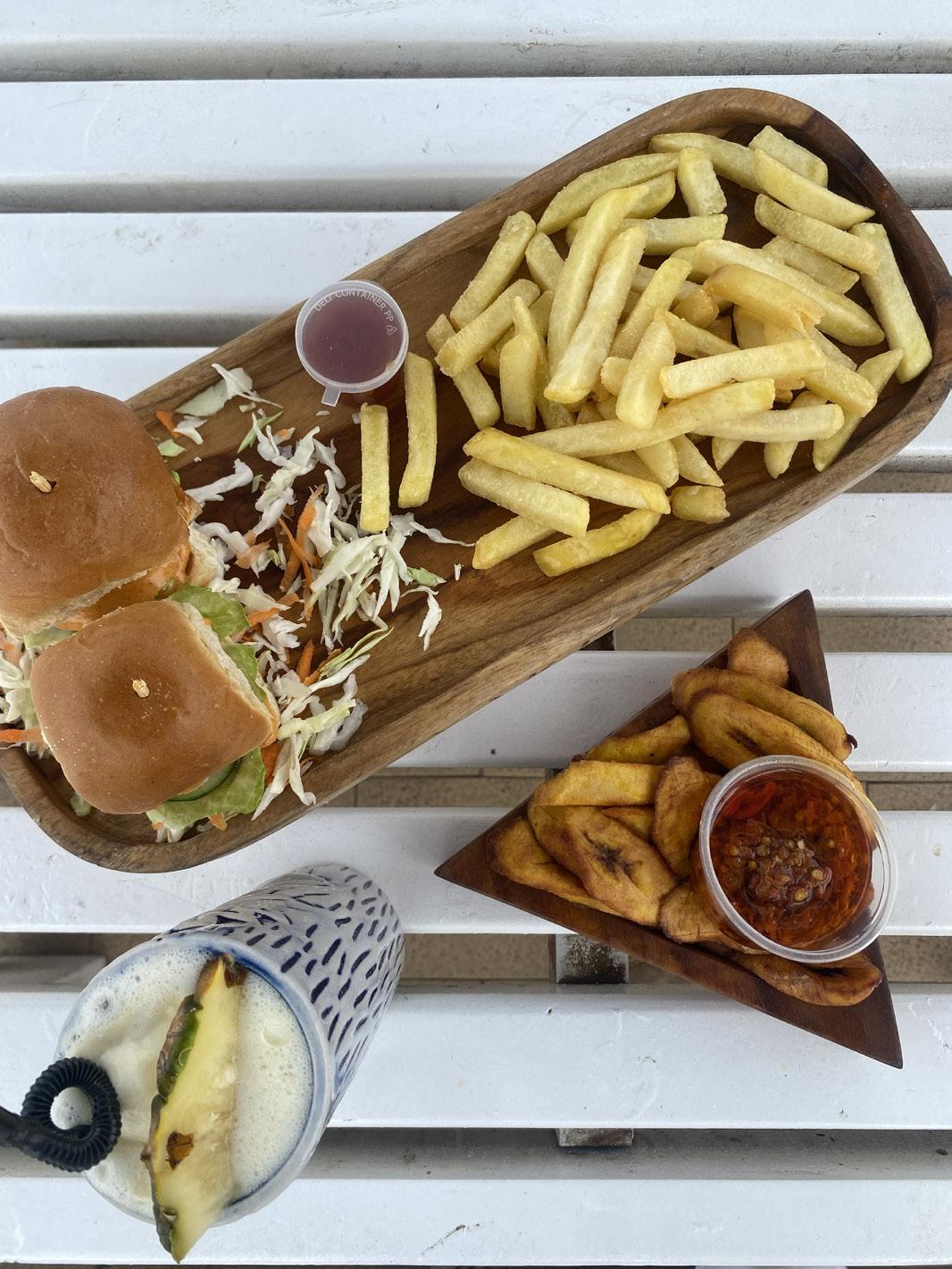 One thing I didn’t like was the meat; it wasn’t as flavourful nor as soft as I’d hoped, and it was cut in a nugget shape, so I really couldn’t bite into it without making a mess. I’ll tell you for free, if you are here on a date, please avoid the burgers. Try the plantains instead. They tasted good, kudos to the chef, the presentation was magnifique, but it wasn’t easy to eat without messing yourself up. The fries, on the other hand, were perfectly crispy, and I ate every bit of them. What I didn’t expect from this setup was how good the Pina Colada would be. It left an impression on me, and I really, really would go back even if for that alone.