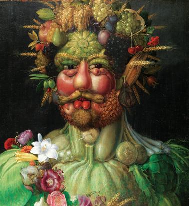 Vertumnus (Verano) Retrato del emperador Rodolfo II por Giuseppe Arcimboldo. Todas las frutas y flores que se ven en el cuadro son propias del verano del siglo XVI. Algunos surrealistas lo vieron como un precursor.