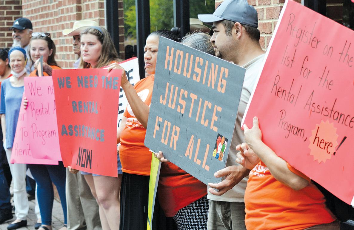 Demonstrators organized by New Virginia Majority demand action on a long-stalled rental assistance program outside the county Department of Housing and Community Development Friday, June 30.