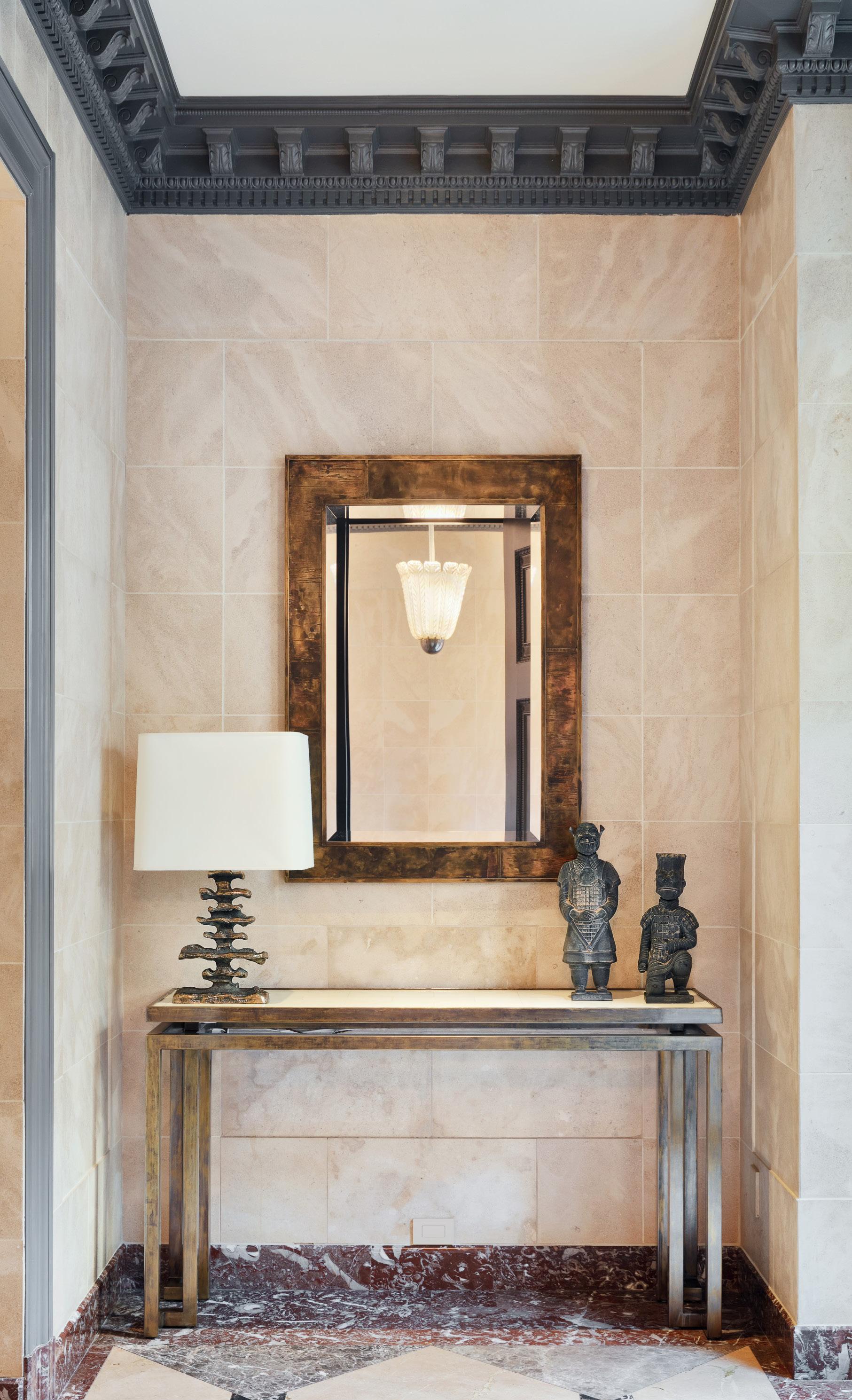 Tucked into the 12-story Second French Empire-style building’s stout-columned portico, a private front door next to the building’s entrance opens to a sprawling layout that spans roughly 4,200 square feet with ceilings that soar to 15 feet in some rooms. The residence’s cosmopolitan glamour, courtesy of the French interior designer Jean-Louis Deniot, showcases custom millwork, an array of rare marbles, and artful modern lighting. Indeed, every nook and cranny is a thoughtful balance of comfort and refined elegance.