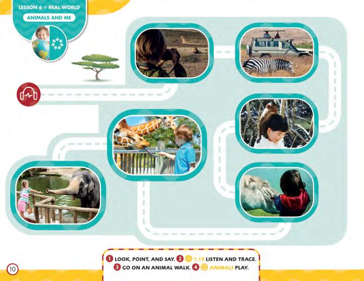 Target language is also reviewed in real-world contexts through photographs and listening activities. The photographs are often taken from a child’s perspective, showing students a view of the topic as they would see it themselves.