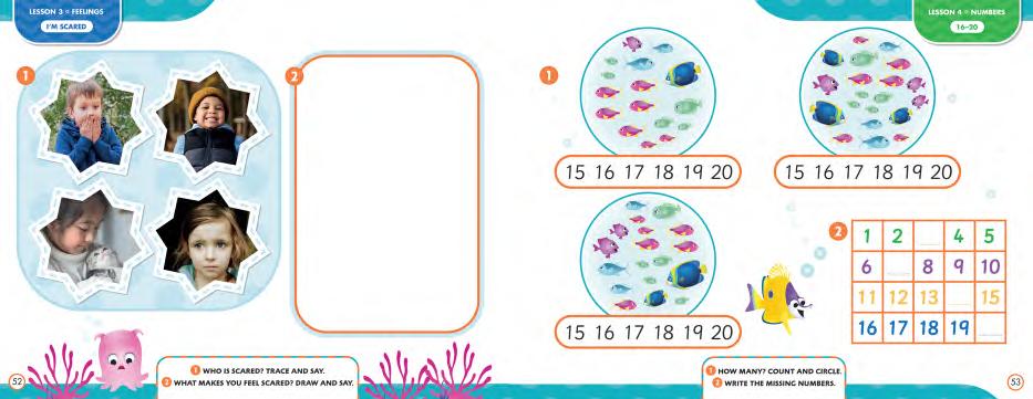 • Persistence and growth: Students begin to work at tasks for increasing periods of time and identify things that are challenging and interesting. These future skills are woven into every lesson of the course. Each unit focuses on a new feeling, which children learn to recognize in themselves, the characters, and their friends. The feelings are discussed in a dedicated lesson, but also through chants, stories, and posters throughout the whole unit. As students learn to recognize these feelings in others, they are encouraged to treat them with understanding and respect.