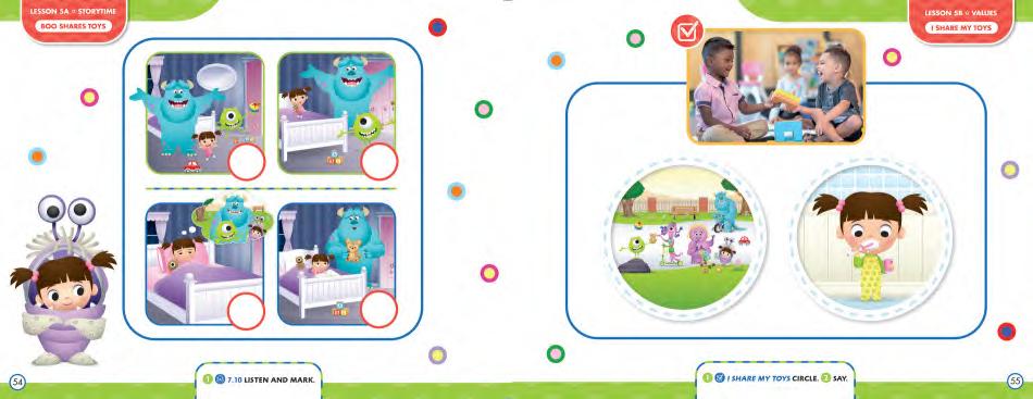 • Persistence and growth: Students begin to work at tasks for increasing periods of time and identify things that are challenging and interesting. These future skills are woven into every lesson of the course. Each unit focuses on a new feeling, which children learn to recognize in themselves, the characters, and their friends. The feelings are discussed in a dedicated lesson, but also through chants, stories, and posters throughout the whole unit. As students learn to recognize these feelings in others, they are encouraged to treat them with understanding and respect.