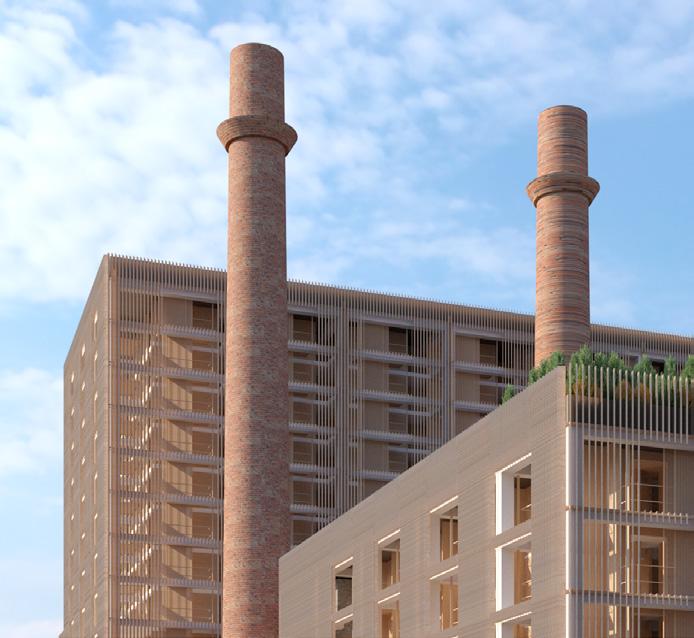 behide the historic chimney stacks were converted into a large mixed-use residential project.