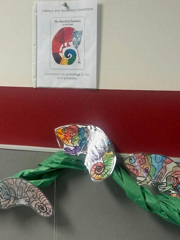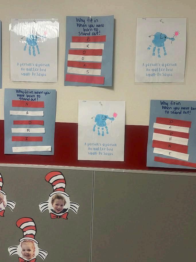 The halls of the Lovejoy Child Development Center are filled with colorful reminders of how literacy inspires creativity in our youngest learners. Using favoritestoriesasafoundation,studentshavetransformedtheirunderstanding of books into imaginative artwork. From the adventures in Harold and the PurpleCrayonandthecreativetransformationsofTheMixed-UpChameleonto classic tales like Little Red Riding Hood and the many playful stories by Dr. Seuss, our students are bringing literacy to life. Their artwork throughout the hallsreflectshowchildren’sbookssparkimagination,helpingstudentsexpress ideas,buildlanguage,andconnectreadingwithcreativity.