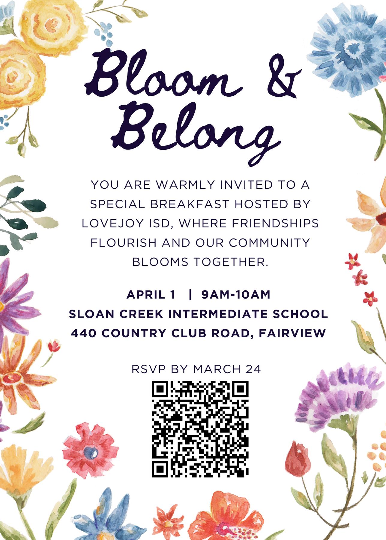 Lovejoy ISD invites our Silver Leopards and community membersage65andoldertojoin us for the Bloom & Belong Breakfast on April 1 from 9:00–10:00 AM at Sloan Creek Intermediate School. Enjoy breakfast, connect with friends, andcelebratethefriendshipsthat help our Lovejoy community flourish.