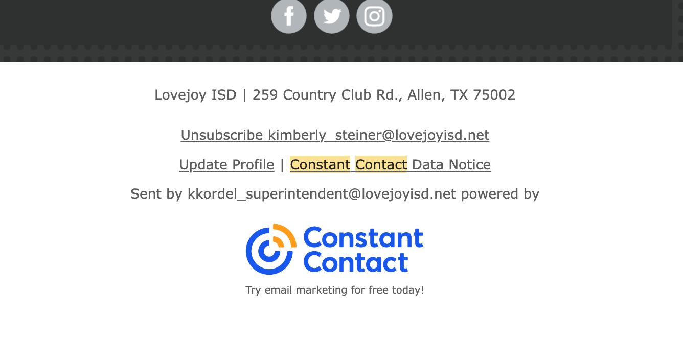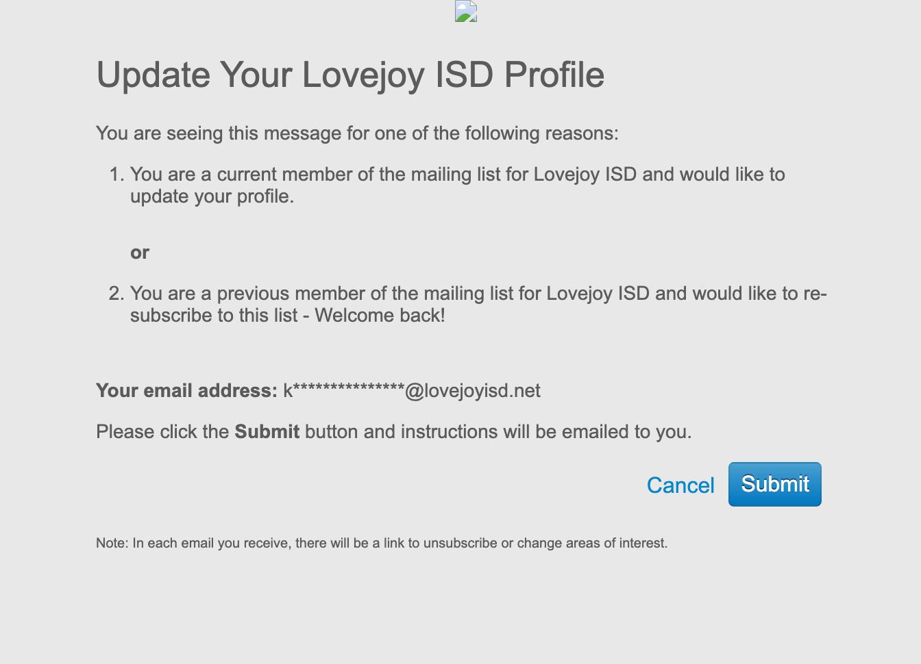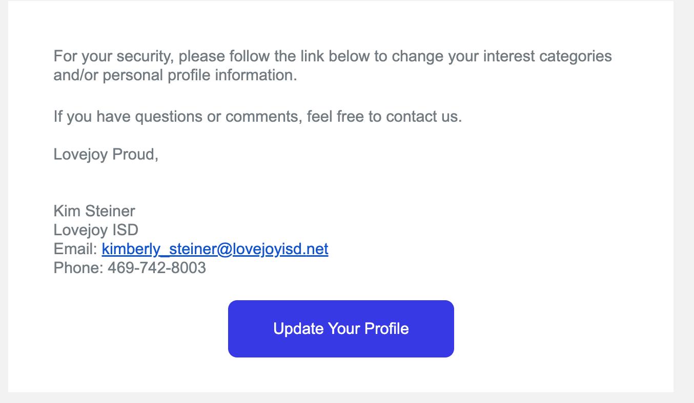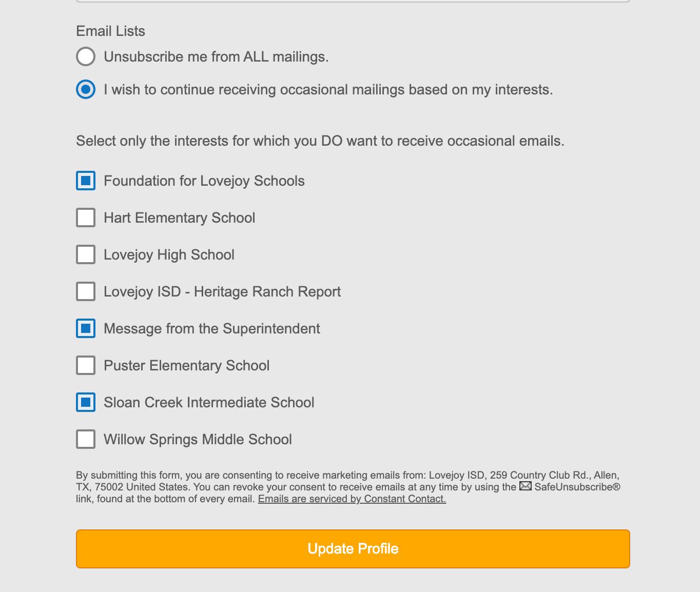 Campus & District Newsletter Preferences The beginning of the year is a great time to update your family newsletter preferences in Constant Contact. At the bottom of this email you will see an option to "Update Profile." Click this link. On the next screen you will want to ensure you are updating the correct email address and click "Submit." An email will be sent for security purposes and from there you can click to "Update Your Profile." On the last screen, please review your contact information and update your campus/district newsletter preferences to match your kiddo's current campus(es).