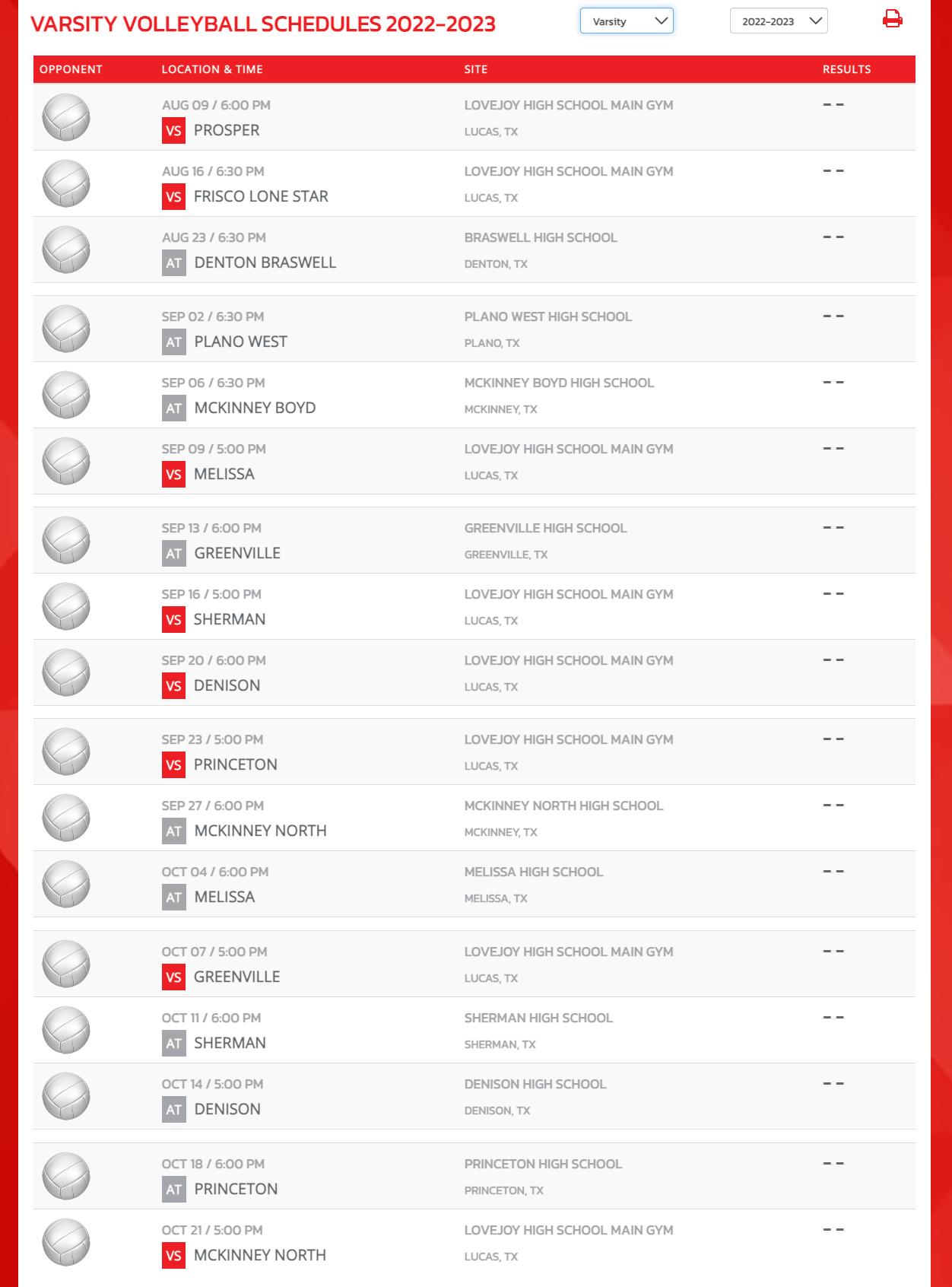 Page 24 LHS Volleyball Schedules Click the schedule below to be redirected to athletics website with all Lovejoy volleyball team schedules.