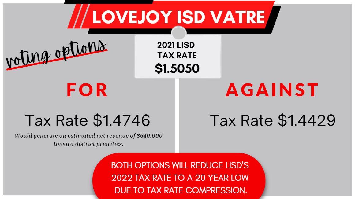 On Monday night, the Lovejoy ISD Board of Trustees called for a Voter Approved Tax Rate Election (VATRE) for November 8, 2022 to increase the M&O portion of the 2022 ISD tax rate by 3.17 cents. Due to tax compression, the tax rate will decrease with or without the passing of the VATRE. The passing of the VATRE would generate approximately $640,000 in additional funding for Lovejoy ISD.