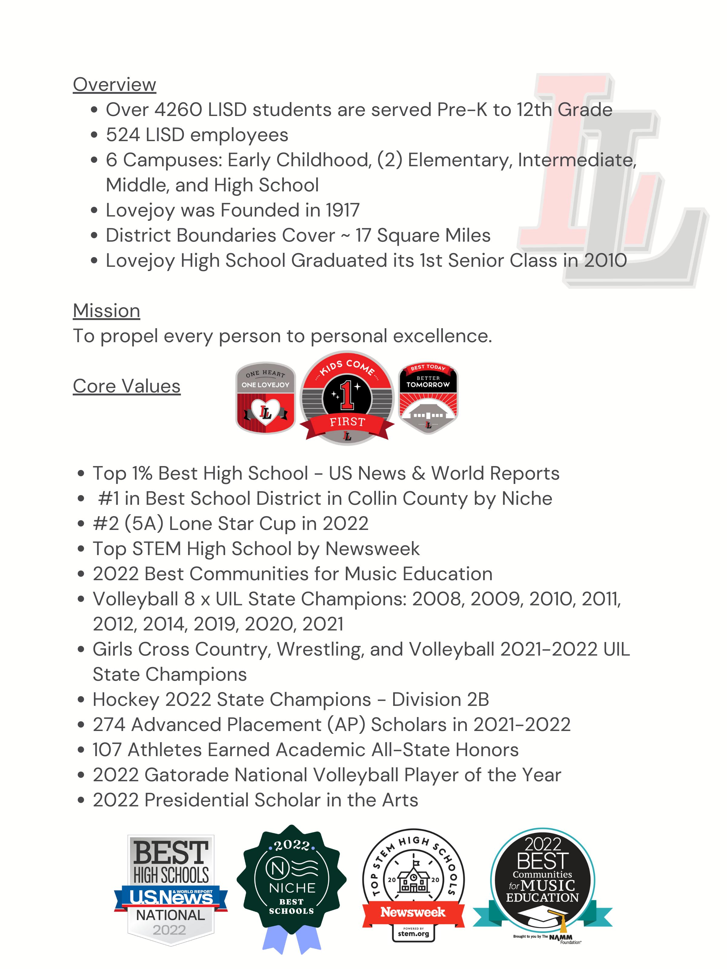 the start of the school year with our annual teacher and staff convocation. Our district theme this year is Team Lovejoy. This theme represents our priority on collaboration, connection, and community. Our students’ success depends on Team Lovejoy; the precious and powerful partnership of teachers, staff, parents, and community members. In Lovejoy ISD, we believe in a team approach to supporting students. I want to extend a sincere thank you for your active engagement in your child’s education. This commitment was evident in your attendance at so many of our back to school events.