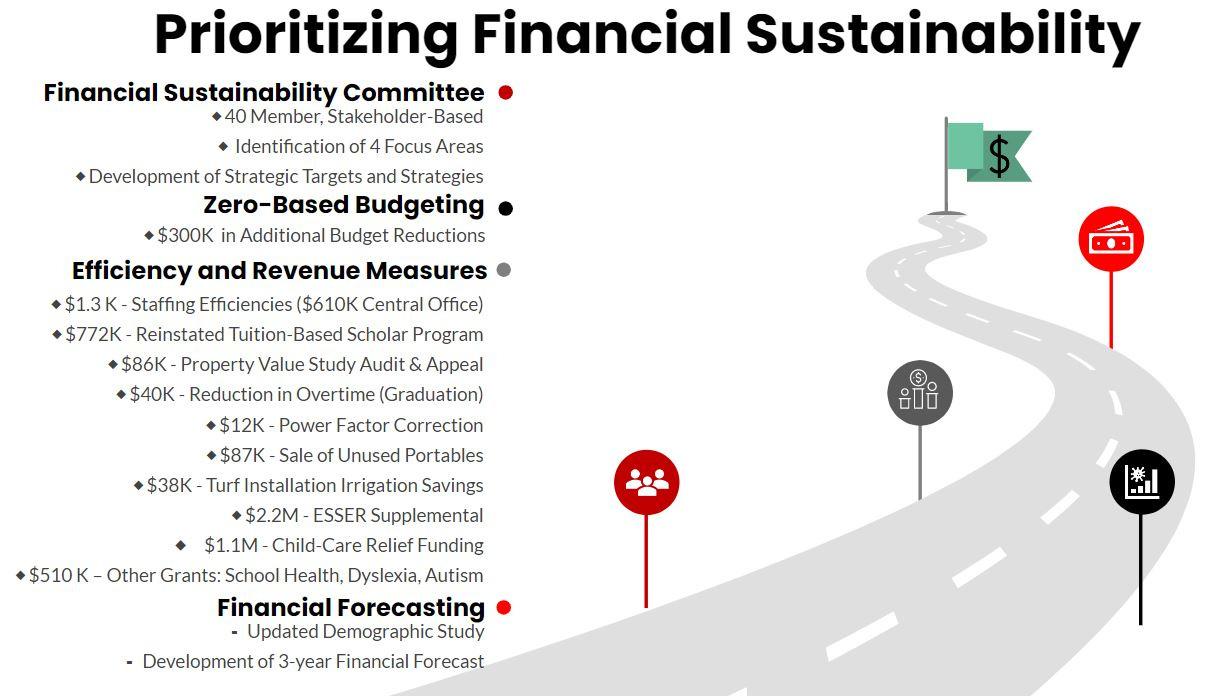 At Monday night’s Board Workshop, the District’s finances, projections, and proposed tax rate were presented. Current financial projections show a $44,527 deficit in FY24 with 100 days of fund balance, $1,045,556 deficit in FY25 with 86 days of fund balance, and $2,137,508 in FY26 with 65 days of fund balance. The Board discussed the baseline of 90 days and target of 120 days of fund balance to address cash flow needs. The financial sustainability measures taken in the last year, including the work of the stakeholder based Financial Sustainability Committee, were reviewed and are found below.