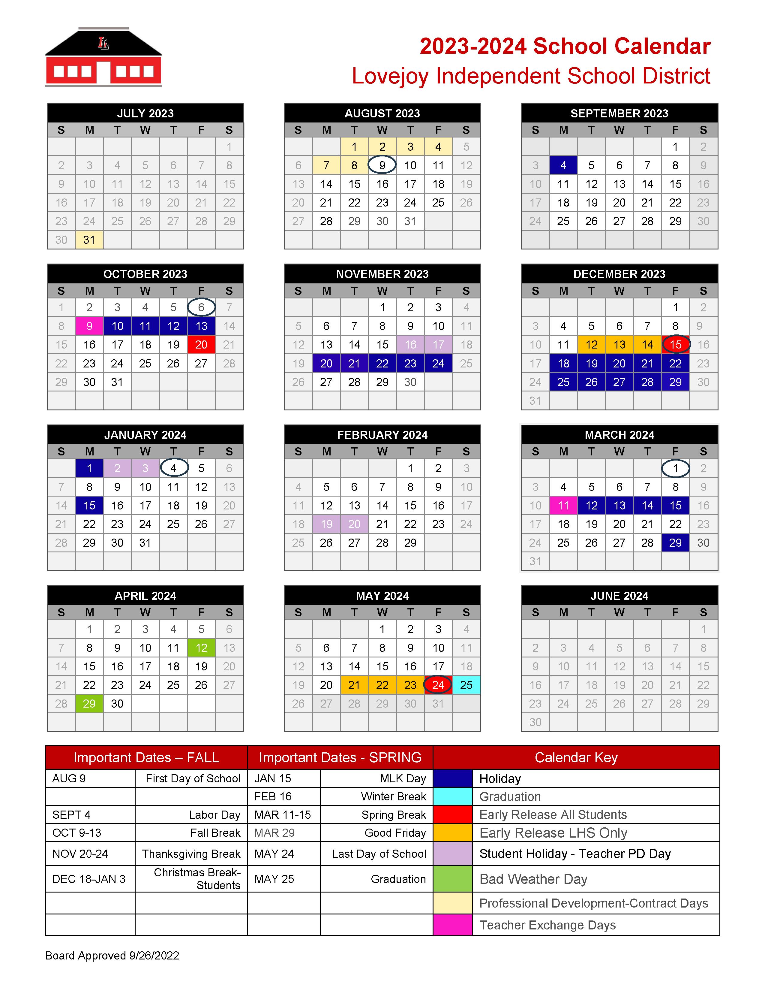 On Monday, September 26, the Lovejoy ISD Board of Trustees approved a district calendar for the 2023 2024 school year. Calendars are also posted on the LISD website for easy future reference HERE.