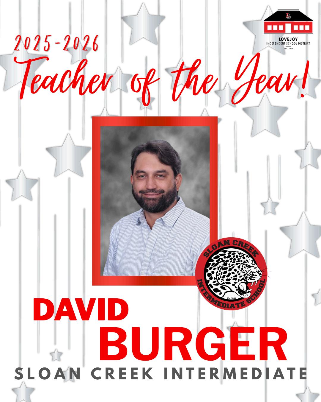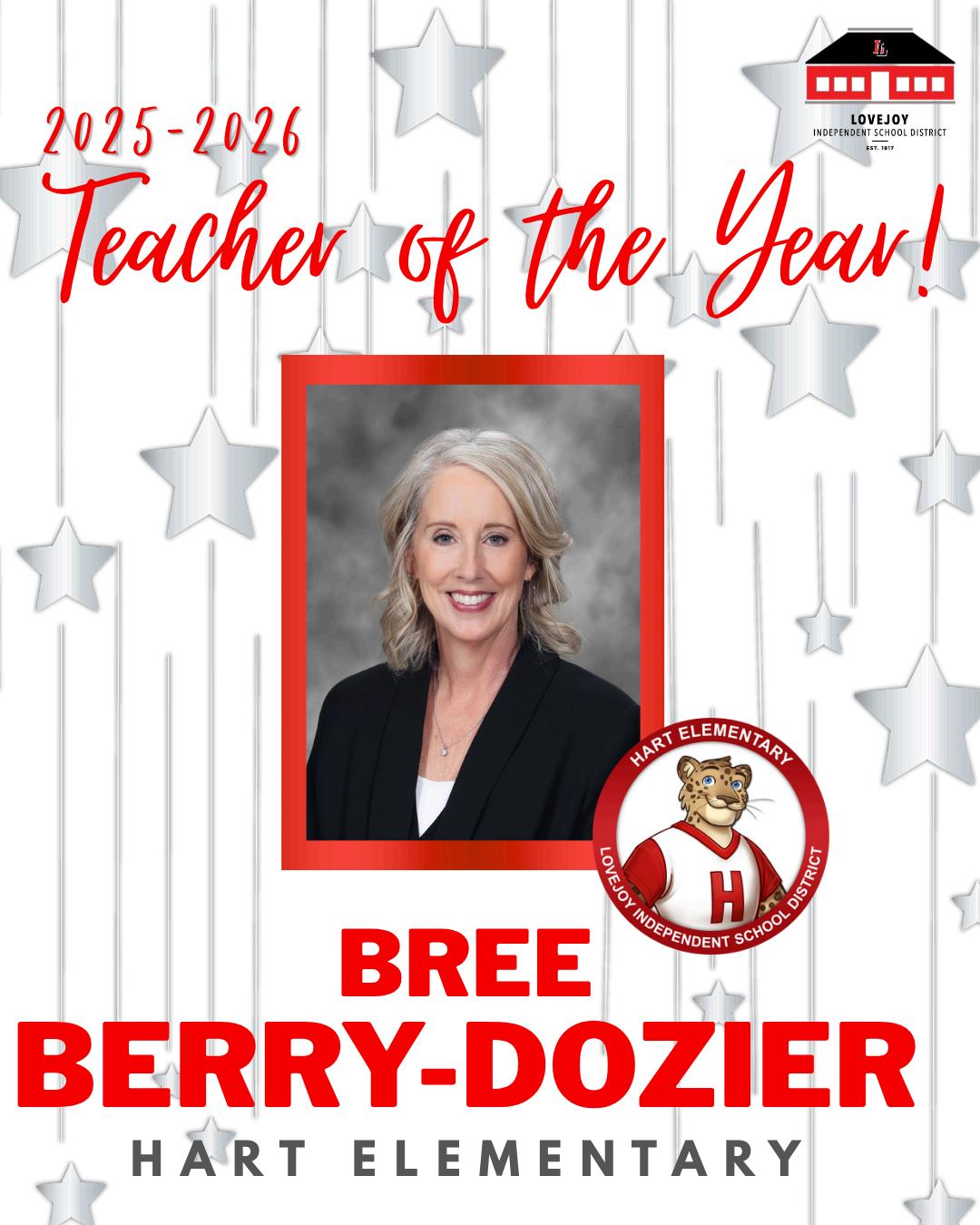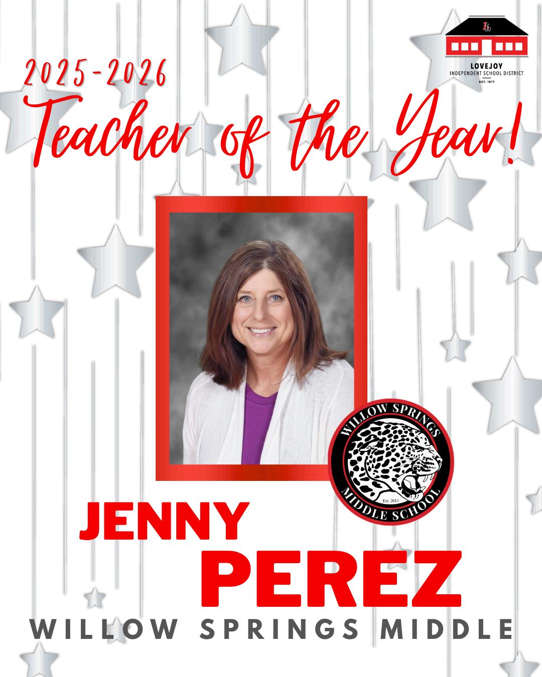 We are thrilled to celebrate our six Campus TeachersoftheYear,eachofwhomrepresentsthe very best of Lovejoy ISD. These outstanding educators exemplify excellence, dedication, and heart in all they do. They pour their passion into creating meaningful learning experiences, building strong relationships, and inspiring our students to grow and succeed. Their commitment reaches far beyond the classroom, shaping the culture of our campusesandmakingalastingimpactonthelives ofthosetheyserve.Weareincrediblyproudofeach Campus Teacher of the Year and grateful for their impact.