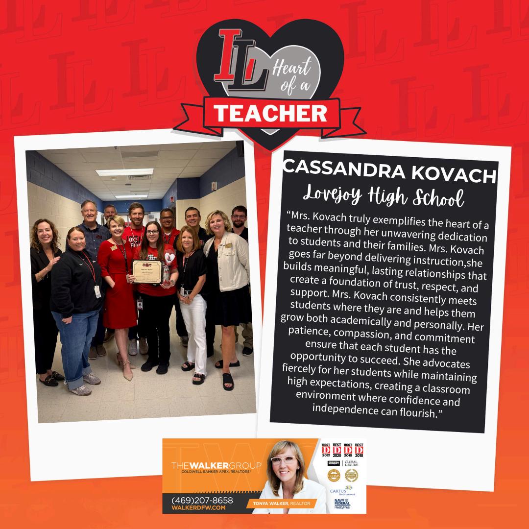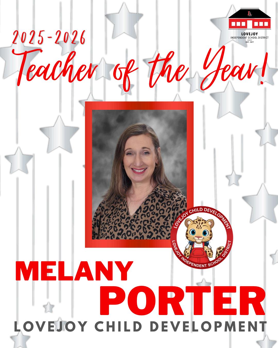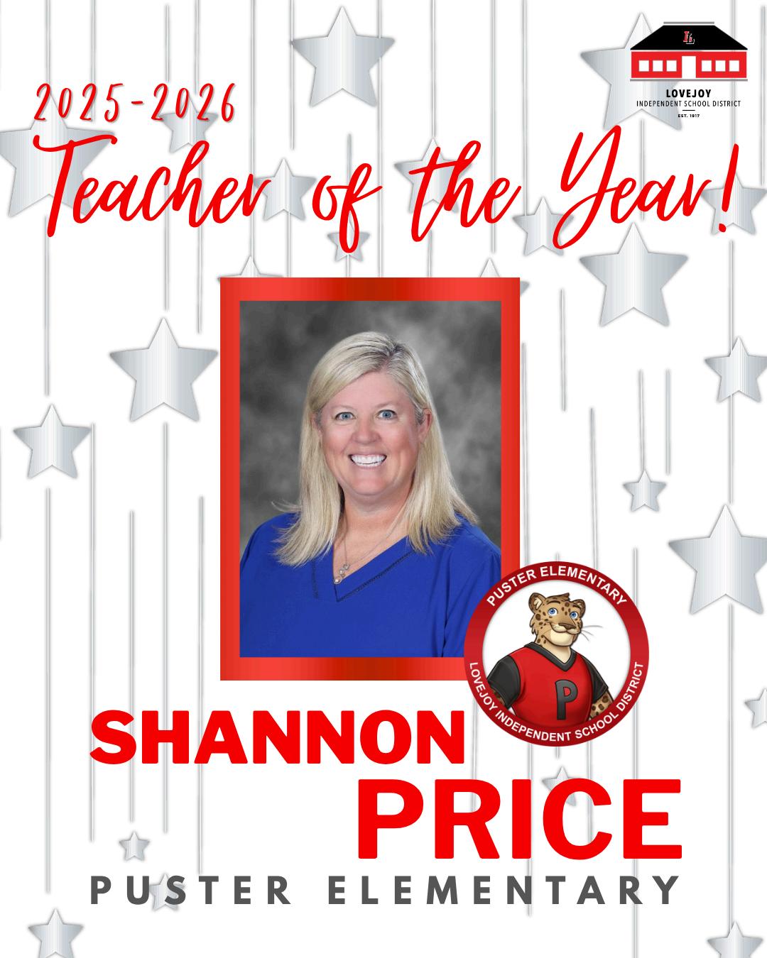 We are thrilled to celebrate our six Campus TeachersoftheYear,eachofwhomrepresentsthe very best of Lovejoy ISD. These outstanding educators exemplify excellence, dedication, and heart in all they do. They pour their passion into creating meaningful learning experiences, building strong relationships, and inspiring our students to grow and succeed. Their commitment reaches far beyond the classroom, shaping the culture of our campusesandmakingalastingimpactonthelives ofthosetheyserve.Weareincrediblyproudofeach Campus Teacher of the Year and grateful for their impact.