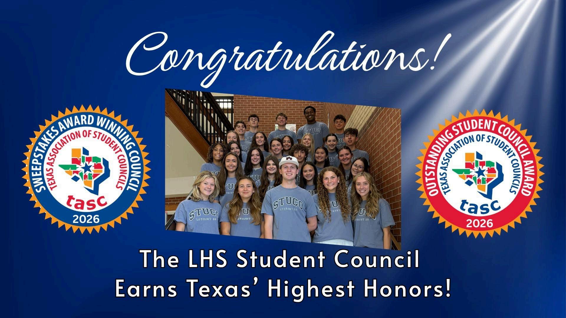 CongratulationstotheLovejoyHighSchoolStudentCouncilforbeingrecognizedbythe Texas Association of Student Councils (TASC) as an elite, comprehensive student leadership organization. This prestigious Sweepstakes Award is earned through extensive documentation of service, leadership, and dedication to both school and community. To achieve this distinction, councils must first be named an Outstanding StudentCouncilandearnsuperiorratingsacrossallprojectcategories: