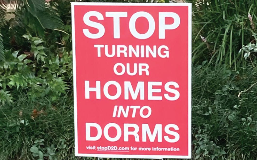 Walk through the neighborhoods surrounding campus and you will see signs posted outside homes: “Stop turning our houses into dorms.” It is a quiet but powerful statement. It re ects frustration from people who feel like their commu-