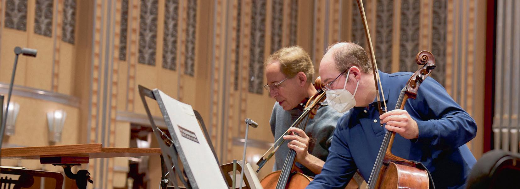 Orchestra cellists Richard Weiss (L) and Mark Kosower at rehearsal. Photo by Roger Mastroianni.